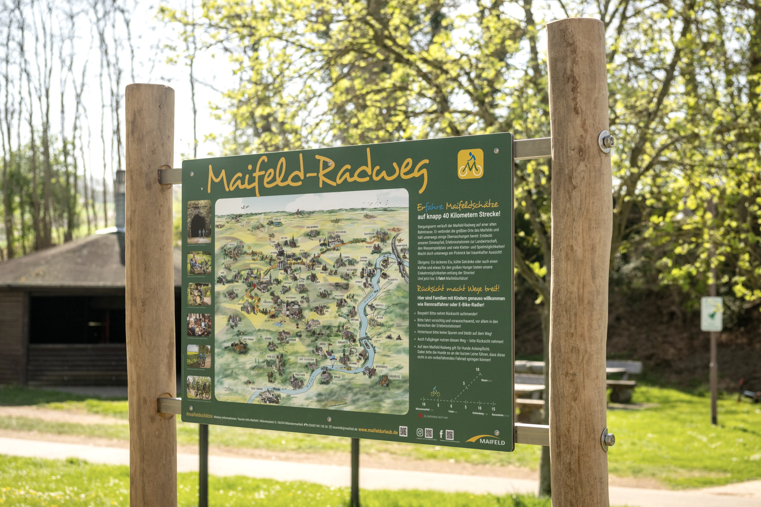 Pause muss man auf diesem Weg noch keine einlegen, in dreieinhalb Kilometern ist man schon in Mertloch angekommen. Hier locken ein Spielplatz, Weidentipis, Schaukeln und ein Klettergerüst. Ein kleines Stückchen weiter, vorbei an zwei spannenden Tafeln zur Landwirtschaft und zum Getreide auf dem Maifeld, ist dann auch noch der Wasserspielplatz! Hier gibt’s eine große Rutsche, Spielgeräte für die ganz Kleinen und auch die Möglichkeit, die Füße zu erfrischen. Ein tolles Ziel für eine kleine Radrunde! Am Streckenhäuschen kann man sich mit einem Eis oder Kaffee belohnen oder an den Spielplätzen auf den Bänken ein Picknick machen.