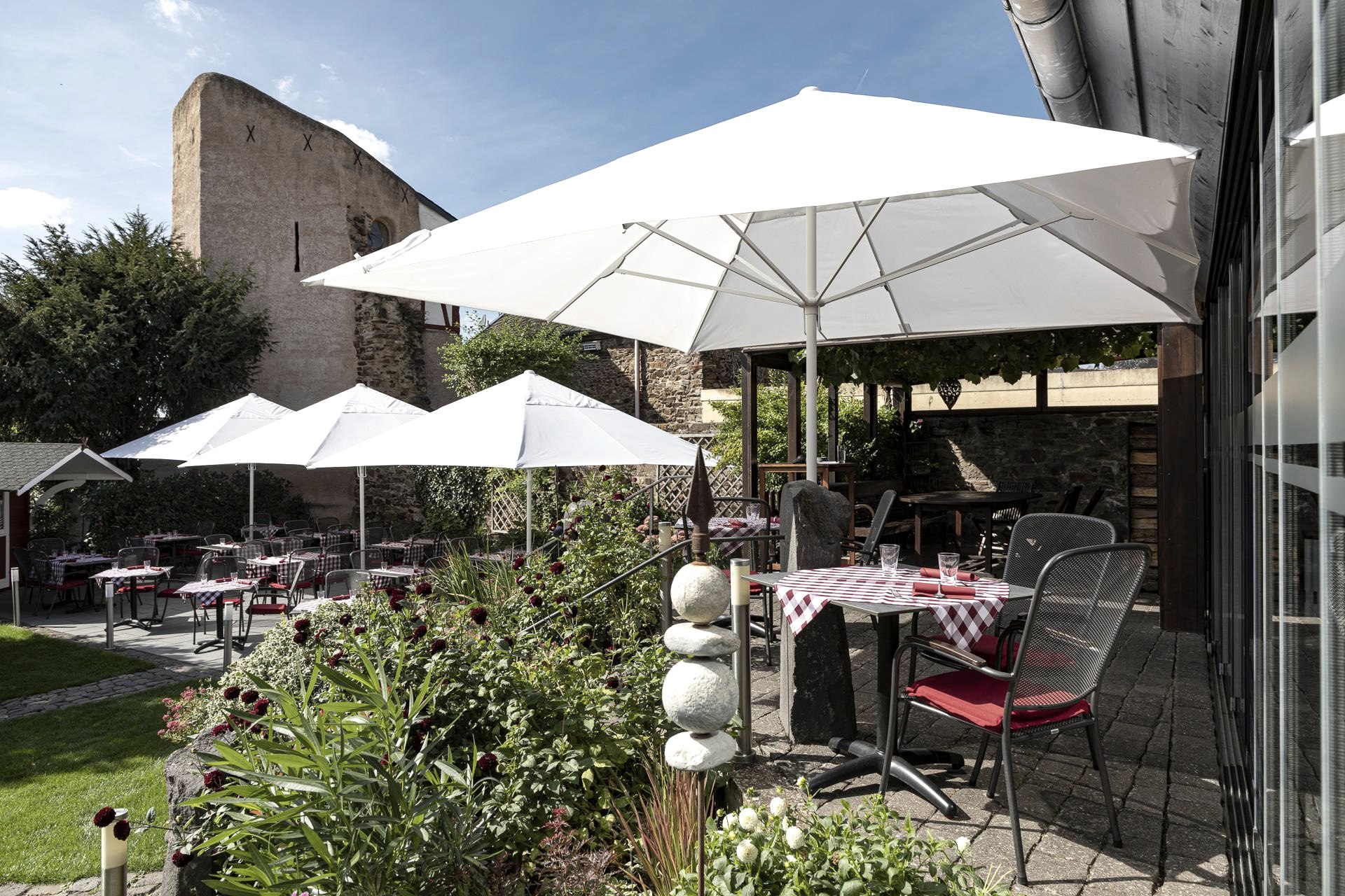 hinweist. Der Bauerngarten liegt direkt an der mittelalterlichen Stadtmauer, an einem der wenigen erhaltenen Wehrtürme von Münstermaifeld und dient in der wärmeren Jahreszeit als Terrasse im Grünen.