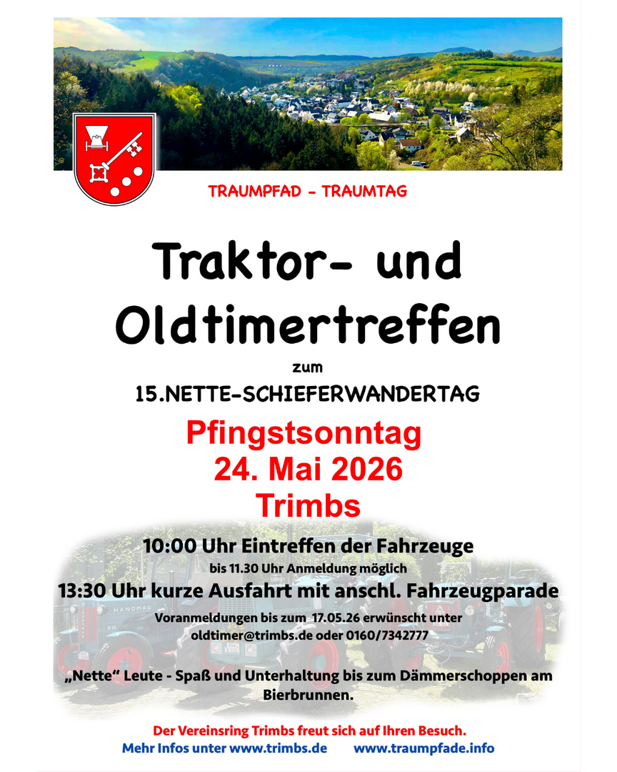 Wandern, genießen und Oldtimer erleben – das alles an einem Tag!Am Pfingstsonntag, 24. Mai 2026, lädt Trimbs zum 15. Nette-Schieferwandertag mit großem Traktor- und Oldtimertreffen ein. Freuen Sie sich auf abwechslungsreiche Wanderungen, historische Fahrzeuge, Live-Musik und regionale Spezialitäten in geselliger Atmosphäre.