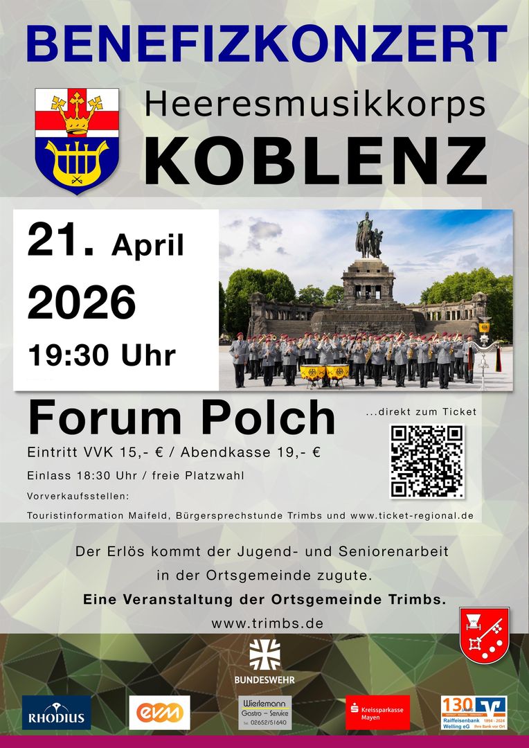 Die Ortsgemeinde Trimbs lädt am 21. April 2026 zu einem Benefizkonzert mit dem Heeresmusikkorps Koblenz in das Forum Polch ein.