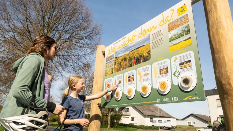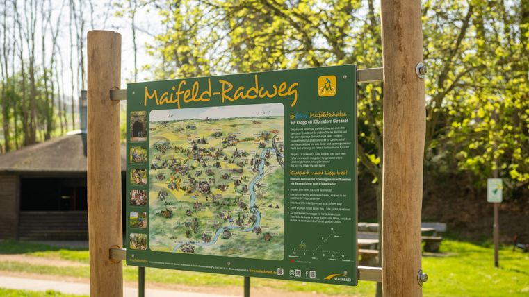 Der Weg ist durch das Logo Maifeld-Radweg gekennzeichnet.