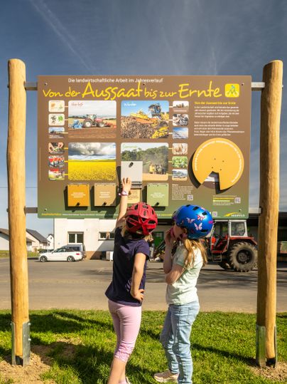 Gestartet wird in Naunheim. Während die Eltern die Räder startklar machen, können die Kleinen schon mal an den Getreidehalmen entlangklettern. Dann geht’s los Richtung Mertloch. Man kann toll in die Felder gucken, oft sieht man einen Traktor bei der Arbeit oder je nach Jahreszeit auch große Mähdrescher.