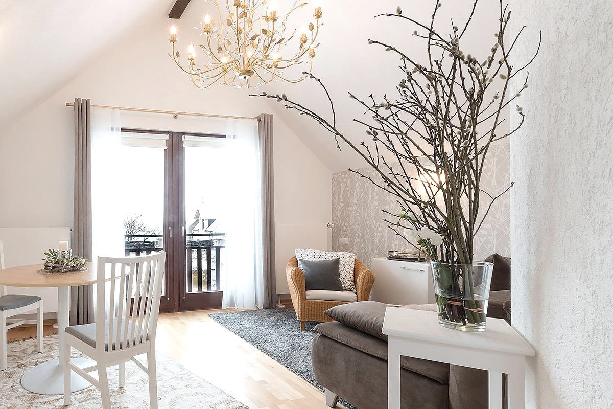 Liebe zum Detail eingerichtet. Großräumiges Wohnzimmer mit Ausblick über das