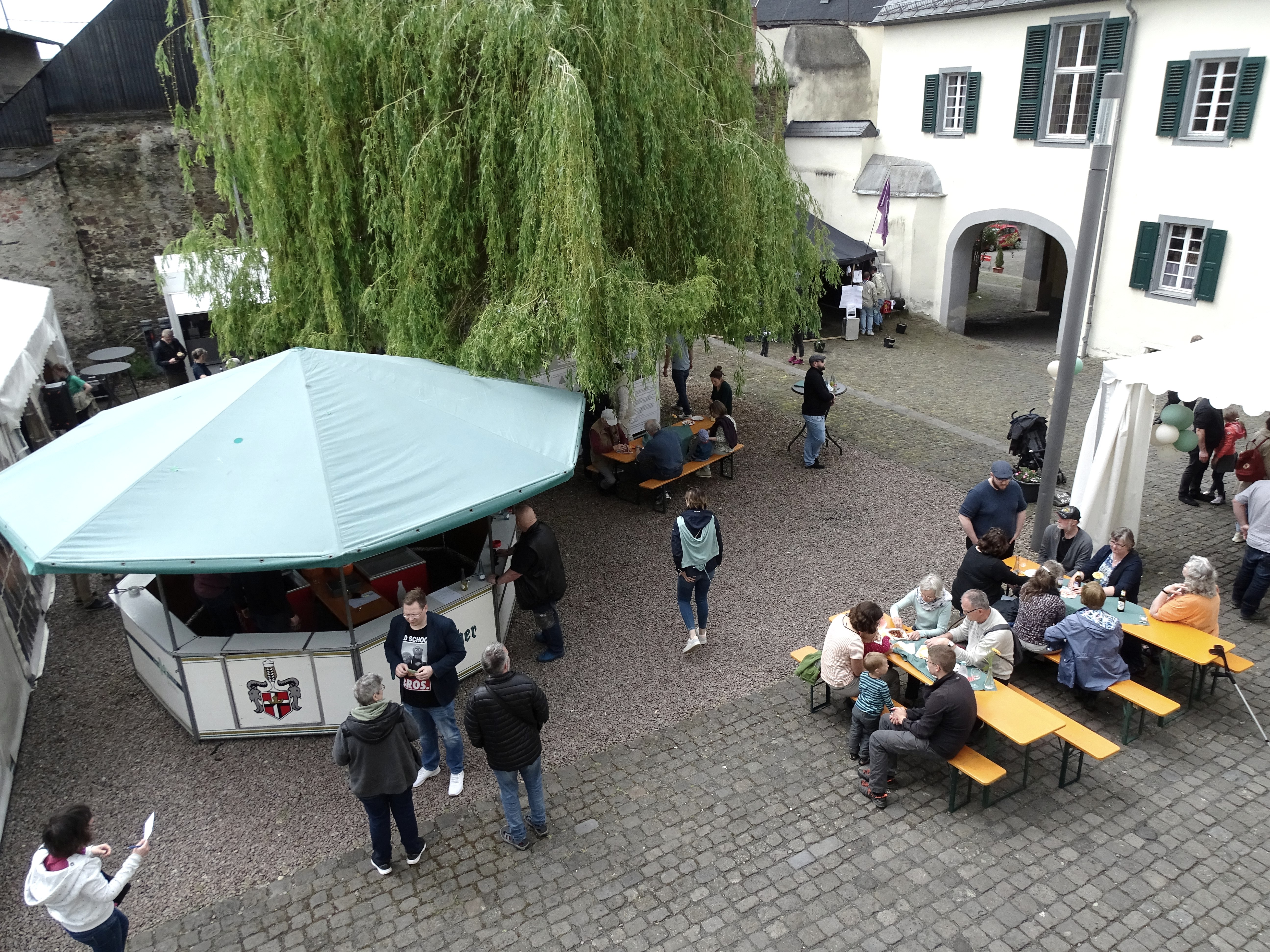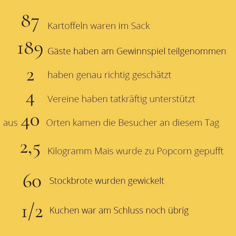 Musikalische Stimmung brachten der KUBA-Chor und die Stadtkapelle vor einem vollen Zelt. Das Gewinnspiel, bei dem die Stückzahl Maifelder Grumbiere im Sack geschätzt werden sollte, amüsierte Jung und Alt. Die Stadtführer boten sowohl eine Stadtführung durch Münstermaifeld an, als auch eine Märchenlesung in der Propstei I – hier wurden die Stühle sogar mehrfach besetzt!