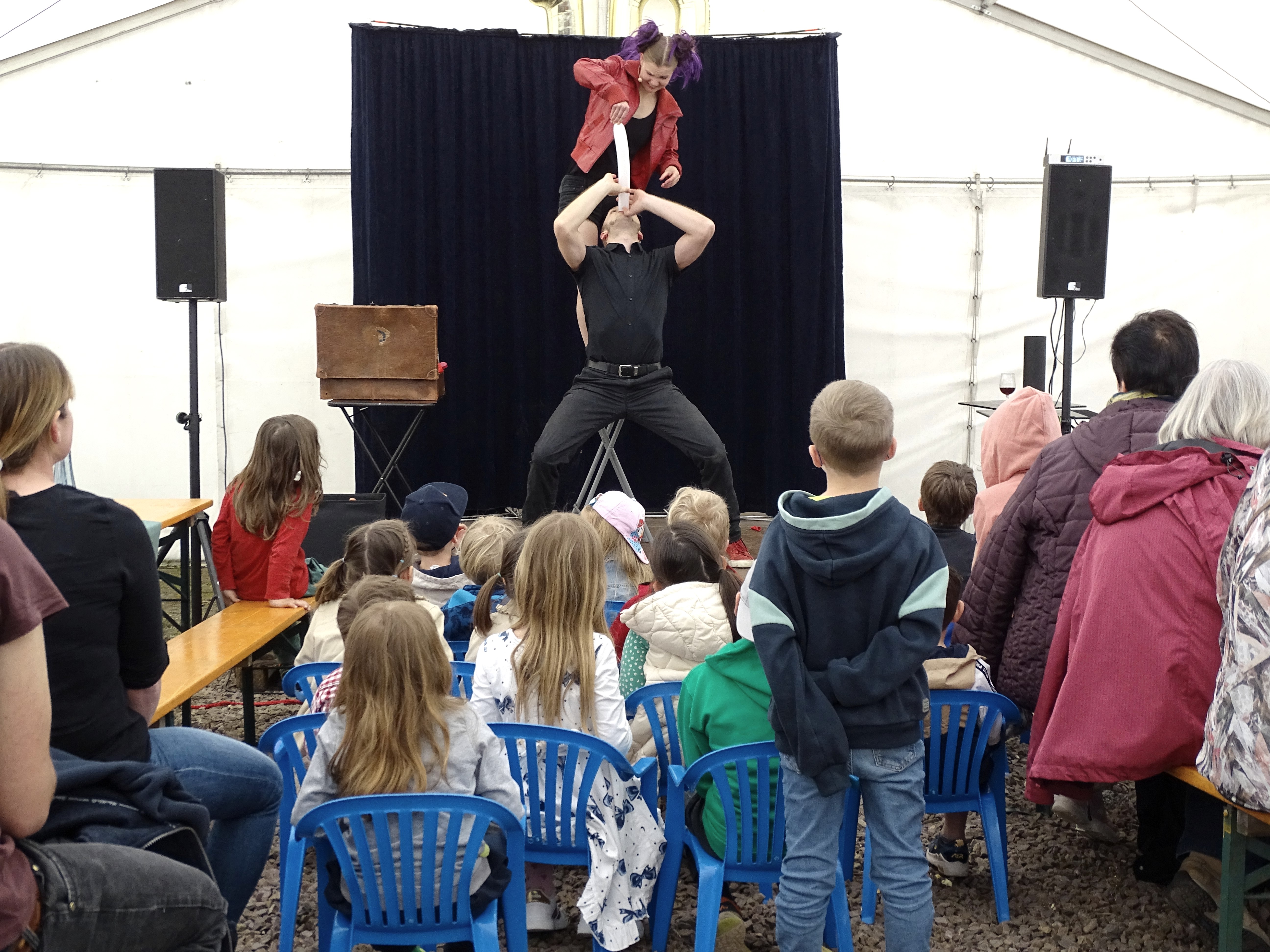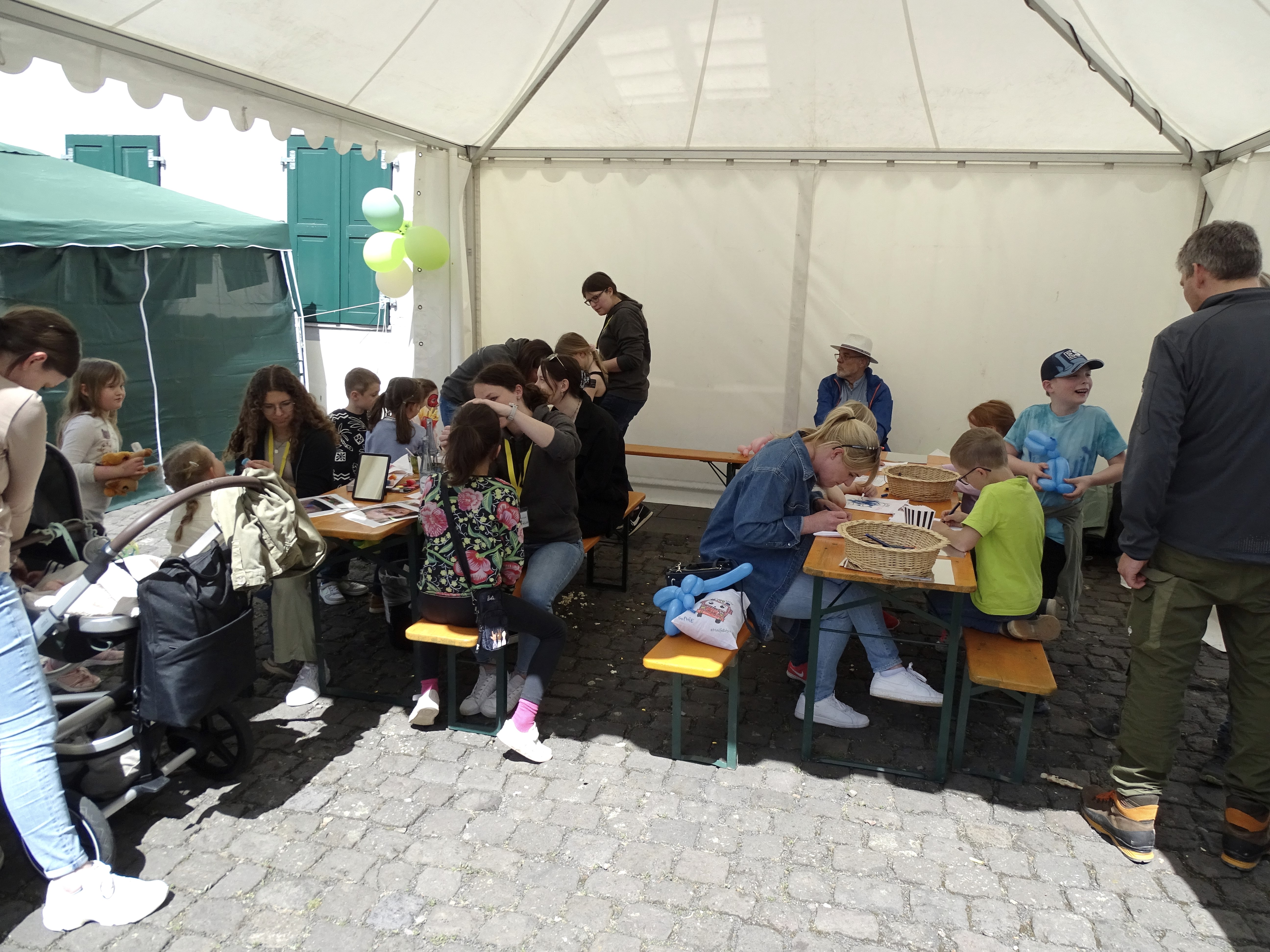 Für die Kleinen war der Tag ein besonderes Vergnügen, neben den Leckereien konnten noch Steine und Taschen bemalt werden. Dazu wurden die Kinder vom JUX-Team der Verbandsgemeinde Maifeld geschminkt und es gab lustige Figuren aus Luftballons. Auch die großen Besucher staunten nicht schlecht, als Zauberer Jakob Mathias zusammen mit LiLaLucie eine Weinflasche verschwinden ließ und zwar kein Schwert, dafür aber einen superlangen Luftballon verschluckte!